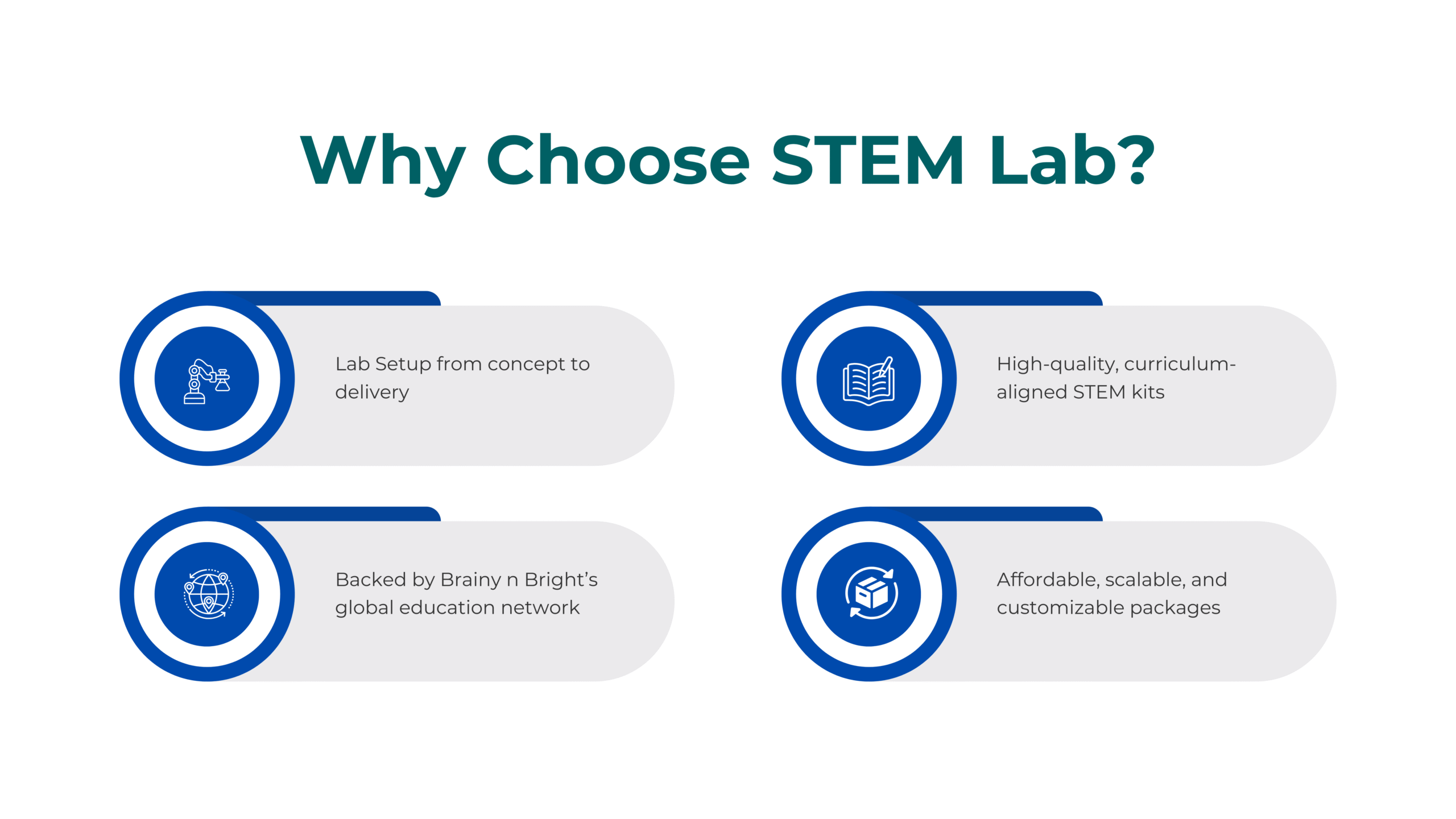 At STEM Lab by Brainy n Bright, we are committed to transforming education through hands-on learning, creativity, and innovation. As a dedicated division of Brainy n Bright, we specialize in designing, developing, and delivering cutting-edge STEM education that prepares students for the technology-driven world of tomorrow.