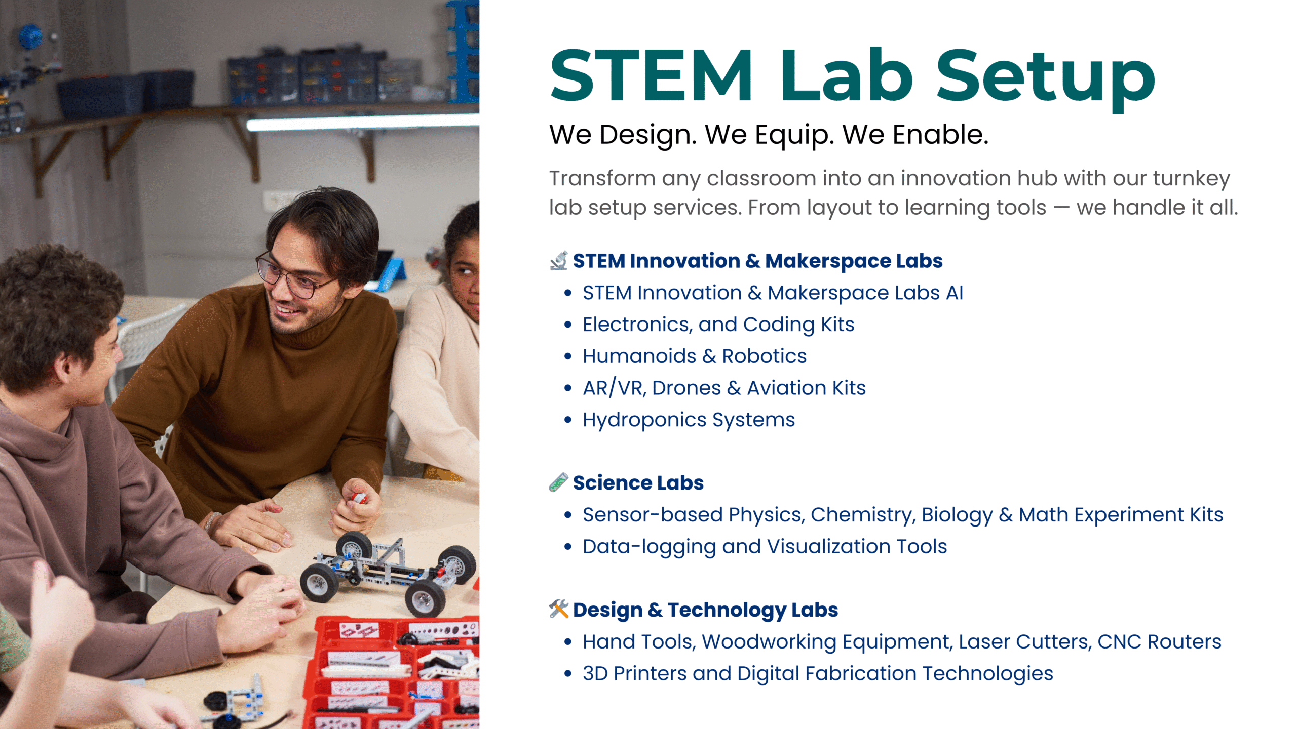 Curriculum-aligned STEM kits and learning aids that bring lessons to life. We integrate lab activities into your programs and train teachers to confidently deliver engaging, hands-on STEM learning.